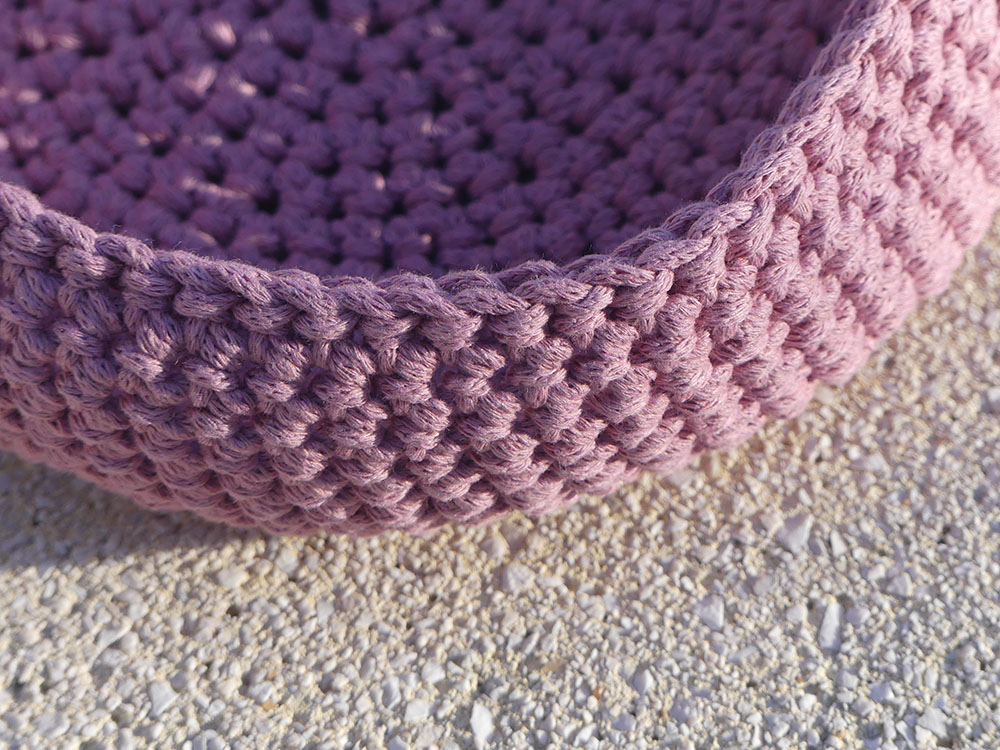 Corbeille en coton de couleur vieux rose entièrement réalisée à la main en crochet.