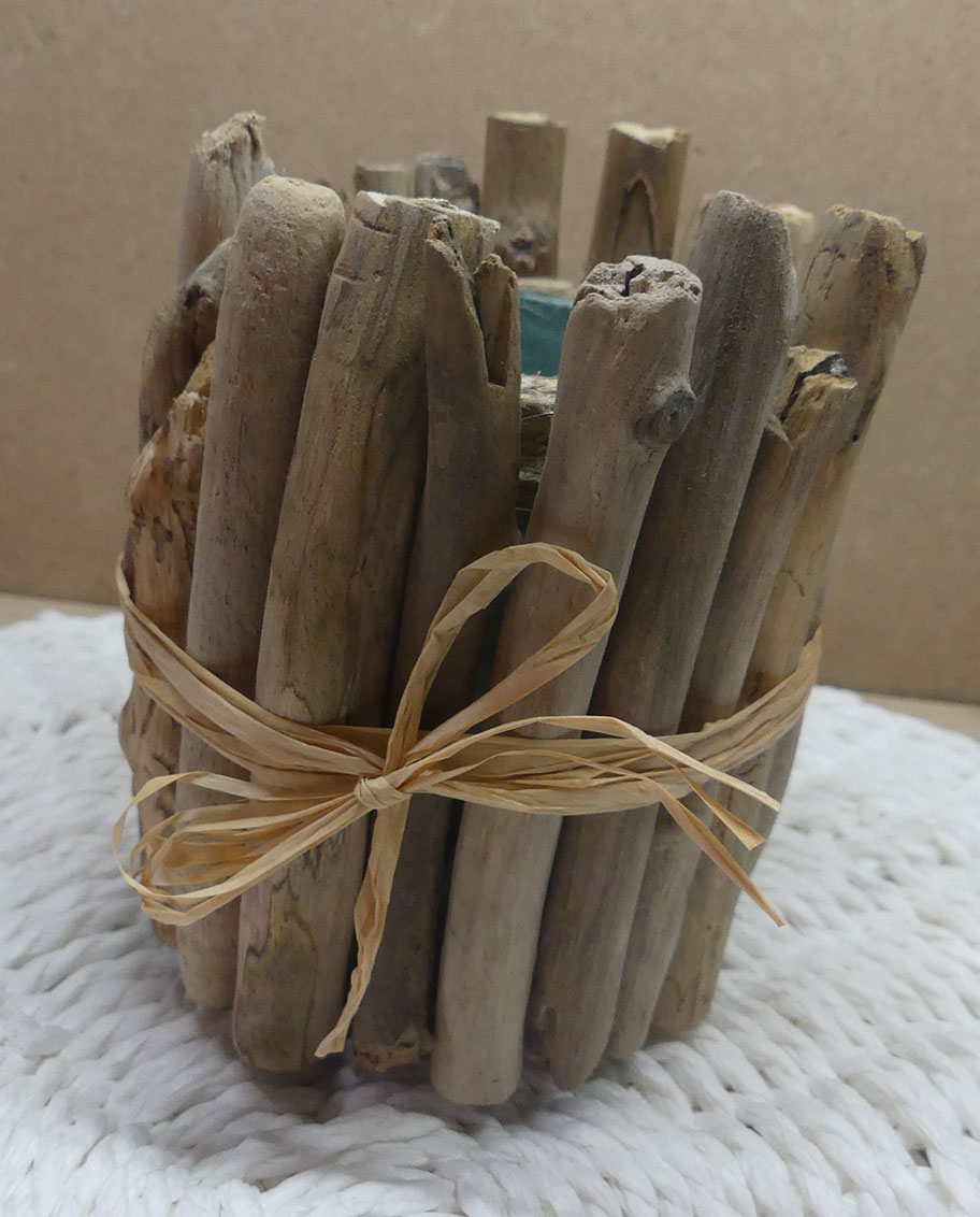 Matériaux utilisés : pot en verre, bois flottés, ficelle de jute, raphia.
